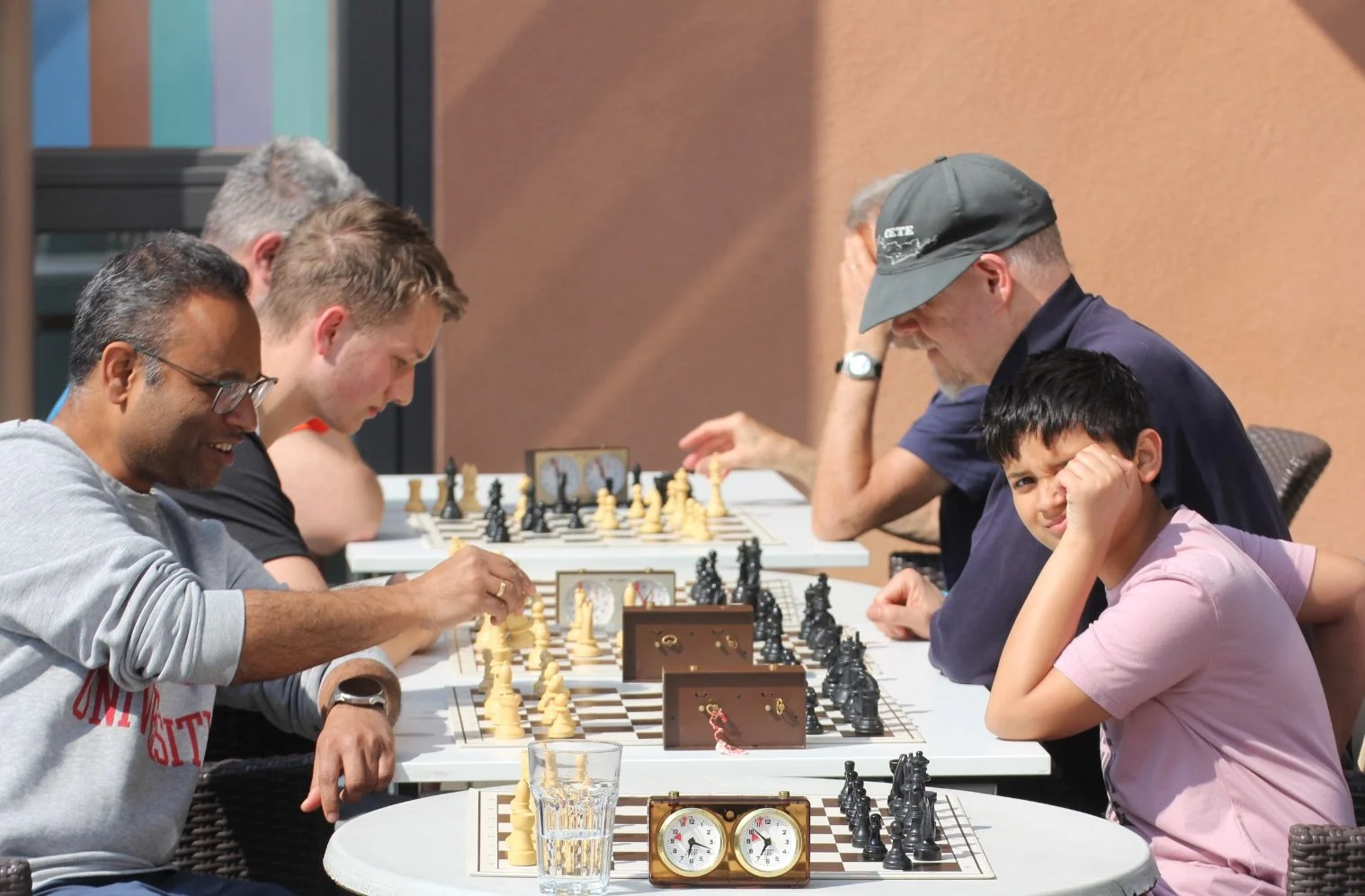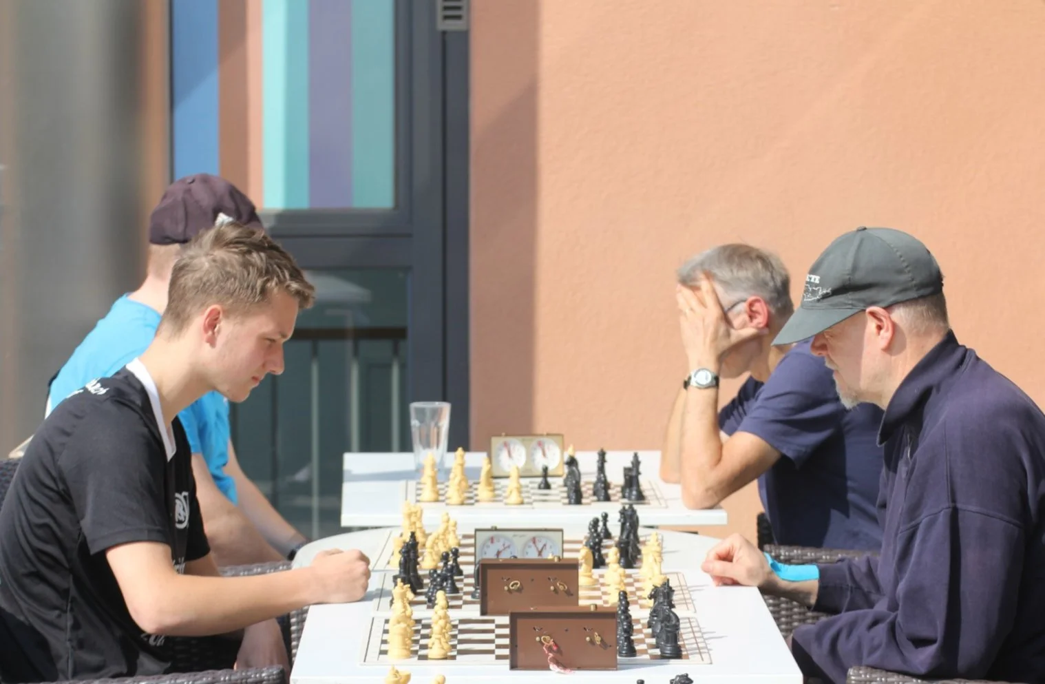 Bei herrlichem Wetter fanden einige Schachfreunde den Weg auf die Terrasse der Stadtbücherei Lauf. Mit viel Leidenschaft und Spaß wurde sowohl am Großfeld als auch an mehreren “kleinen” Bretten gespielt.